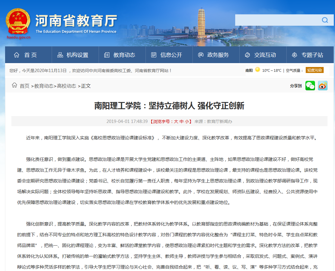 近年来,南阳理工学院深入实施《高校思想政治理论课建设标准》, 不断加大建设力度、深化教学改革,有效提高了思政课程建设质量和教学水平。