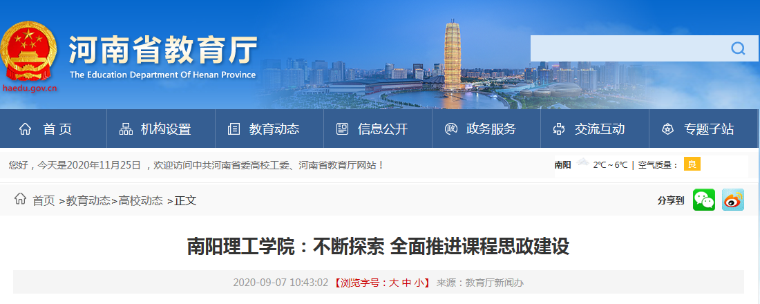 近年来,南阳理工学院坚持“无课不思政、无师不育人”的教育理念,不断探索、开展课程思政教育教学改革,基本形成了可复制、可借鉴、可推广的南工模式。
