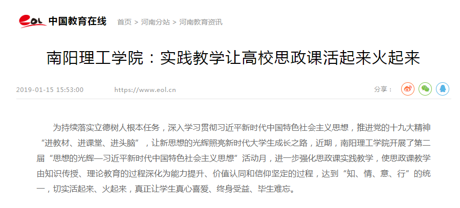 为持续落实立德树人根本任务,深入学习贯彻习近平新时代中国特色社会主义思想,推进党的十九大精神“进教材、进课堂、进头脑”,让新思想的光辉照亮新时代大学生成长之路,近期,南阳理工学院开展了第二届“思想的光辉—习近平新时代中国特色社会主义思想”活动月,进一步强化思政课实践教学,使思政课教学由知识传授、理论教育的过程深化为能力提升、价值认同和信仰坚定的过程,达到“知、情、意、行”的统一,切实活起来、火起来,真正让学生真心喜爱、终身受益、毕生难忘。